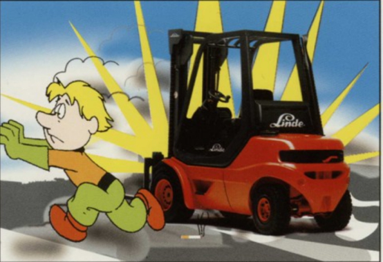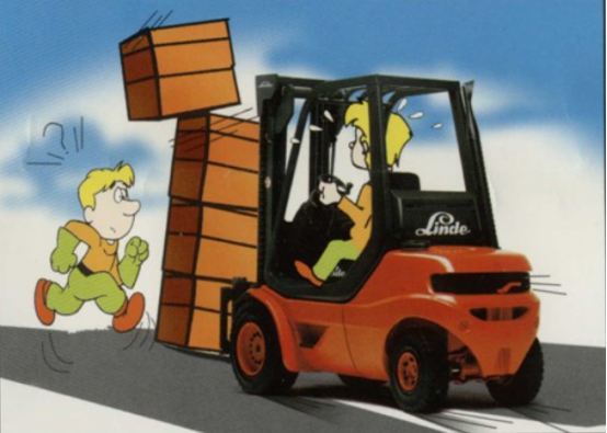 不允許任何人站在或經過提升起的貨叉下,也不允許直接站在叉車后部或在叉車轉彎時位于后部回旋區內。